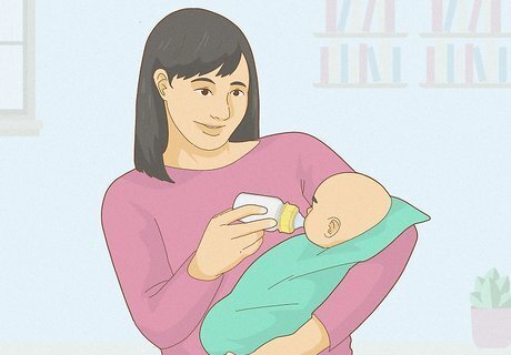 Cradle the baby in a semi-upright position to bottle-feed them. Support the baby’s head in the crook of your elbow with the baby’s body positioned along your inner forearm, with the baby’s head and torso tilted up. Bottle-feeding a baby that’s lying flat can pose a choking risk, which is why it’s best to have the baby in a semi-upright position. It’s often easier to fit down in an armchair or glider to feed your baby. Try propping your arms up with pillows to make the feeding process easier, too. Make sure the baby doesn’t fall asleep with a bottle in their mouth, as it can cause tooth decay and ear infections.