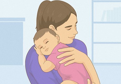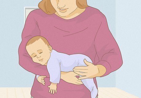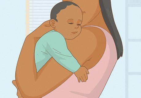 Position the baby upright, resting on your chest and shoulder. Use one arm to scoop up the baby’s bottom while supporting the head with your other hand. Then, position the baby upright, bringing them close so you’re making chest-to-chest contact while they can rest their head against your chest and shoulder. “This is a great position to soothe a toddler who is getting ready for naptime or bedtime,” says childcare specialist Jessie Davidson. Make sure the hand under the baby’s bottom is supporting most of their weight while the other continues to protect their head and neck. The baby’s head should be facing to one side at all times so they can breathe.