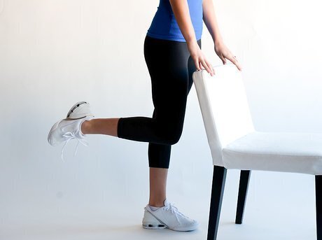 Stand in front of a table or chair, keeping a distance of 12 to 18 inches (30.5 to 45.7 cm), with feet slightly apart. Holding onto the table, lean forward and bend at the hips. Keeping your hips at a 45 degree angle, slowly lift your right leg and extend it behind you, keeping your knee straight. Do not point your toes or bend you upper body. Stay in this position for 2 seconds then return to standing position. Repeat with your left leg. Alternate between both legs and do up to 10 repetitions per leg.