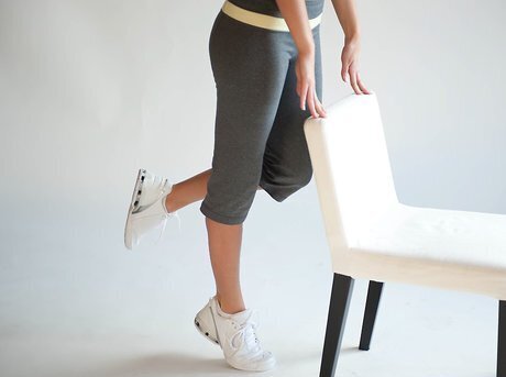 Continue with more standing-in-place exercises. Place your feet apart and keep your weight evenly distributed on both legs. With your hands on your hips, lift your right leg up off of the floor and bend your knee back. Stand in this position for as long as you can, aiming for no more than 30 seconds. Place your foot down and perform the exercise with the other leg.