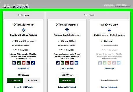 Select a subscription plan. You can get a yearly or monthly Office 365 premium plan, or opt out of the other Office apps and just get a monthly OneDrive subscription. If you want to subscribe to a monthly plan, click the blue Buy for $/month option at the bottom of your selected plan. If you want a yearly plan, click the green Go Premium button below the plan you want.
