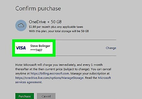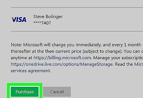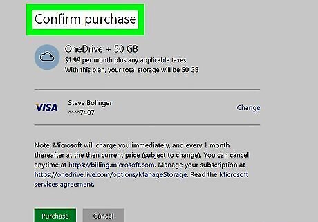 Click the Purchase button. This is a green button at the bottom of the "Confirm purchase" page. It will authorize the transaction, and upgrade your cloud storage account.