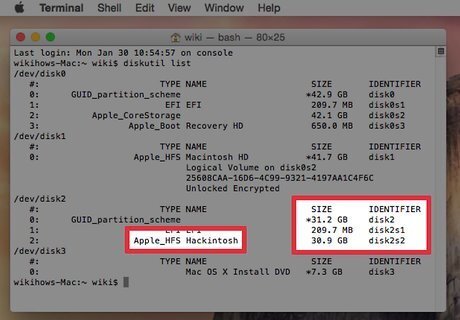 Make sure your USB is still connected and open the Terminal (/ Utilities / Terminal) and type the following command: diskutil list Here we will see what the ID of the USB drive should be 2 identifiers, one for the GUID partition and one for the HFS partition, copy these names, as they will be needed later.
