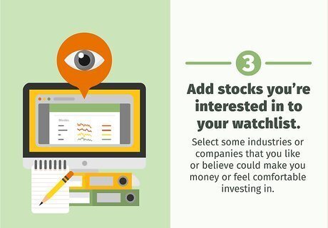 Add stocks you’re interested in to your watchlist. Once you create your account, you will be prompted to select some industries that you either like or would like to invest in. Select some industries or companies that you like or believe could make you money or feel comfortable investing in. You can always add more later, so don’t worry about your initial picks.