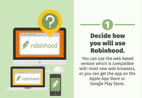 Decide how you will use Robinhood. You can use the web based version which is compatible with most new web browsers, or you can get the app on the Apple App Store or Google Play Store.