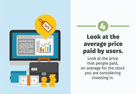 Look at the average price paid by users. Look at the price that people paid, on average for the stock you are considering investing in. If it is below, it is often a better buy than to buy it above average, or even at peak. There are some circumstances where this could be profitable in the long run (recently AMD had several weeks of high percentage gains in a row) but often this is not the way to invest. Look for stocks that are at, near or below their average price paid by other users.