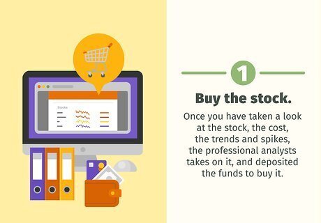 Buy the stock. Once you have taken a look at the stock, the cost, the trends and spikes, the professional analysts takes on it, and deposited the funds to buy it. You can buy the stock. There are 4 types of orders, you will want to use market buy as it is the easiest to understand as a beginner. The easiest order type to be profitable as a beginner is to use a regular market order, execute a market order when you are ready to buy the stock.