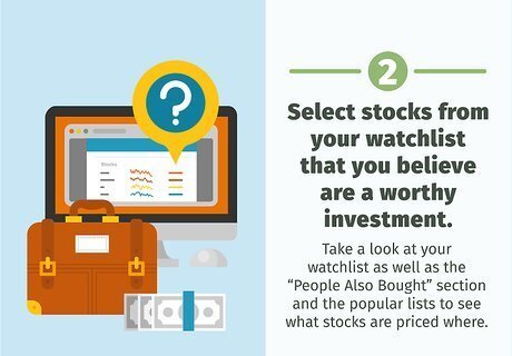 Select stocks from your watchlist that you believe are a worthy investment. Take a look at your watchlist as well as the “People Also Bought” section and the popular lists to see what stocks are priced where. If you see that Microsoft is at a 52-week high, then maybe wait for it to become a little cheaper. By the same token, if a stock is at a 52-week low, wait for it to have an upswing before investing. Some companies can have long periods of growth while others trade nearly horizontal (meaning that their periods of rising and falling are relatively short).