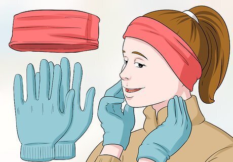 Cover your hands and head. You lose a lot of heat from these areas, and fingers get cold and stiff quickly. Wear a headband to keep your ears warm. If that’s not enough warmth, add a fleece or knit hat. Gloves should be windproof and insulated. Add mittens on top of gloves if your hands are still cold. You can remove these layers if you get hot as you run.