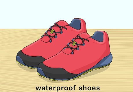 Choose waterproof shoes with good traction. Your shoes should provide extra traction for running in icy or wet conditions.Trail running shoes will have a deeper tread to give you more stability. If you’re running in a lot of snow and need more traction, add spikes that you can strap onto your shoes. Wear shoes with waterproof uppers to keep your feet dry in puddles or melting snow. They should also have breathable liners to wick away moisture.
