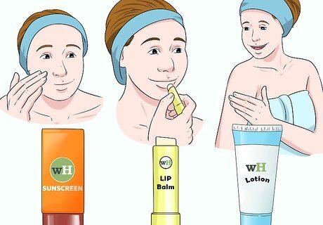 Protect your skin. Cold air is very drying, and sunlight reflects off snow, intensifying UV rays. Cover any exposed skin with a broad-spectrum moisturizing sunscreen and use lip balm, both with an SPF of at least 30. Wear body lotion to keep your skin hydrated.