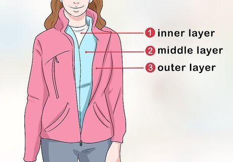 Wear three layers. These layers will help you stay dry and warm by wicking moisture away from your skin, providing insulation, and protecting you from the wind and snow or rain. The inner layer should wick sweat away and fit close to your skin. Opt for synthetics or silk. This layer should keep you dry and not feel scratchy against your skin. Avoid cotton because it will hold moisture, which will quickly turn chilly. A good example is a long sleeved tech shirt. The middle layer is to keep you warm. Pick a fabric that will keep heat against your body without holding moisture, such as a fleece jacket or vest. Experiment to determine how thick this layer should be, depending on the temperatures in your area. The outer layer should provide protection from wind and moisture. It should also be easy to unzip or remove if you get too warm. A lightweight windbreaker is a good choice, and if you need to take it off, you can tie it around your waist.