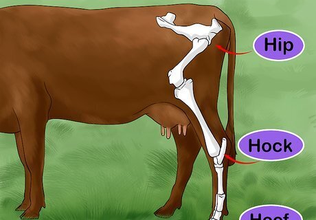 Check that the hips, hocks, and hooves are aligned. Imagine you're drawing a line down each of the heifer's back legs running from the hips, then to the hocks, then to the hooves. The line should be fairly straight for each leg, with minimal bending between the hip and hoof. This indicates a healthy heifer. A slight bend at the knee is natural, but it should barely be noticeable unless you're looking directly at the back legs. Imagine an angle of about 145 degrees to envision an appropriate bend. The hock is the joint found just below the heifer's knee.