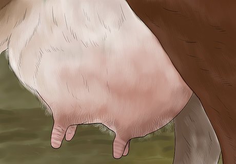 Examine the udders of dairy cattle. Udders should have the same width near the top and bottom, creating a uniform shape. The bottom of a heifer's udders should be slightly rounded and the teats should be plump with clear space in between each teat. The teats should also be shaped like a cylinder and of relatively equal size and shape.