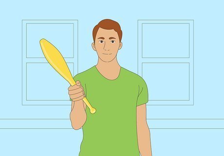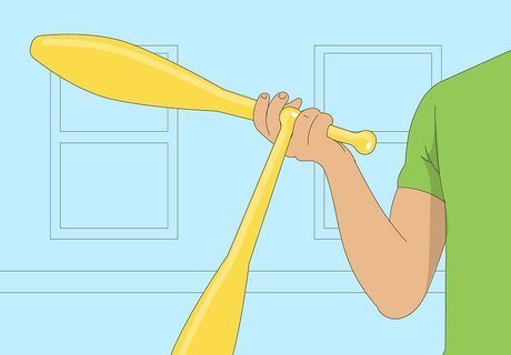 To add in the second club, hold it in your left hand between the middle and ring fingers, and just leave it there. Now continue your single throws, getting used to having a club in the other hand.