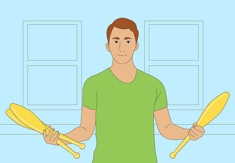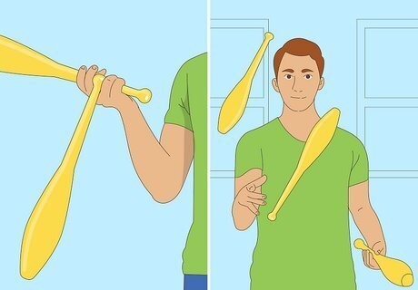 Start like you started juggling three balls. Don't try to hold all three clubs in your hands at first. Just start with one. Hold it in your dominant hand (right, for this article) and practice tossing it to your other hand.