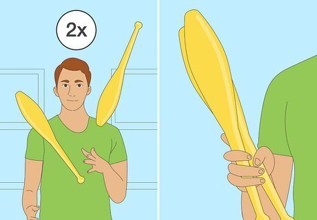 Once you are again getting good consistent throws, add in the second throw just like you did with balls. Toss the second club when the first begins its descent from its apex. Throw it under the first club, and aim for one good flip, then catch it in your right hand.