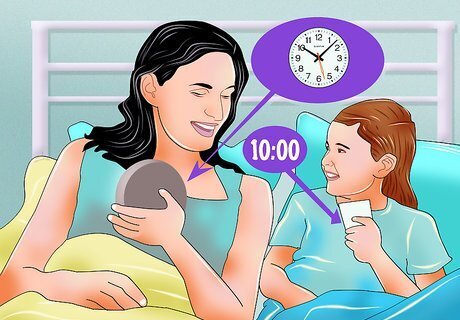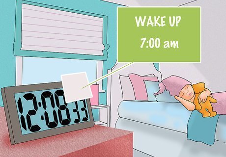 Write the number of the wake up time on the clock. If your child is old enough to read numbers, you can use a visual association on her alarm clock to help her remember her wake up time. It’s important that you transition to the new wake time gradually, so start by using a time that is a half hour or 15 minutes after her normal wake time for the first week and moving the number slowly until you reach the new wake time. Set up a digital clock in your child’s room, by her bed. Take a piece of blank white paper and write the number of her wake time in large print. For example, if their wake time is 7 am, but they tend to get up at 5 am, write “5:30”. Tape the piece of paper to the digital clock. Place it beside the hour and minute numbers so your child can see both set of numbers.