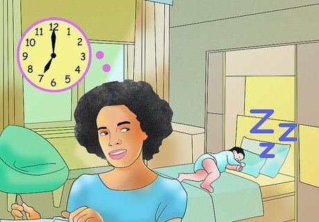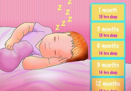 Understand a baby or infant's sleep cycle. Babies, or any child under 1 year old, will have a sleep pattern that will change month to month. It's important that you try to adapt to your baby's changing sleep cycle so you can ensure they are getting enough sleep and is not overly tired during the day. Not all babies are alike, so use these month by month notes as guidelines for your baby's sleep cycle. By one month at home, babies will sleep about 15 hours a day, with about six of those hours during the day. Many babies will give you a cue they are ready for a nap by falling asleep after a feeding or while they are feeding. At three months, most babies will sleep through the night. Your baby's stomach has grown, so they can eat more and sleep longer during the night, about 15 hours, with a decreased nap time of 5 hours. At six months, your baby will need about 14 hours of sleep a day, with 4 hours of nap time during the day. However, some infants may still wake up during the night and may wake up very early in the morning. By nine months, your baby should be able to sleep through the night on a regular schedule. They will need about 14 hours of sleep and only 3 hours of nap time during the day. At 12 months, or 1 year old, most babies should sleep about 13 hours a day. Your baby should sleep 10-11 hours a night, and take a 2-3 hour nap during the day. Some 1 year olds may not be interested in napping, as they are too busy exploring the world and running around, but you should still try to encourage a nap time once a day. This will help your 1 year old maintain a consistent sleep cycle.