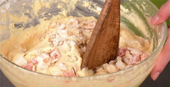 Add the flour coated fruit to the cake batter. Follow the recipe and add the flour coated fruit when appropriate, then transfer to the prepared baking pan.