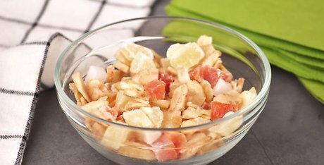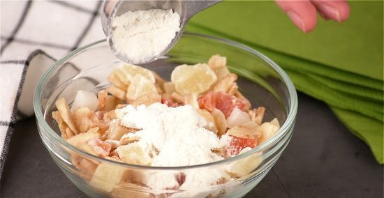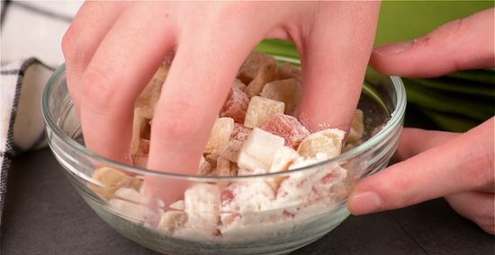 Place the fruit to be added to the fruit cake into a bowl. The fruit should be of the size needed already, so cut if needed before adding to the bowl. Any large pieces of fruit must be cut smaller, in order to prevent their weight from causing these pieces to stick.