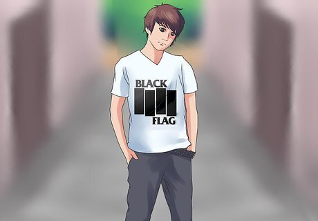 Dress how you want. Hardcore punk is anti-fashion and doesn’t require any signifiers to be a part of the scene. Most so-called “hardcore kids” wear nothing more than a T-shirt with their favorite band’s logo on it and a pair of jeans. No flashy accessories, no weird hairstyles, just normal-looking stuff. Make your own clothes. Don't want to pay $18 at Hot Topic for a Black Flag shirt? Henry Rollins would be the first person to tell you not to. Buy a plain white shirt for a fraction of the price and put the Black Flag logo on it yourself. That’s hardcore.
