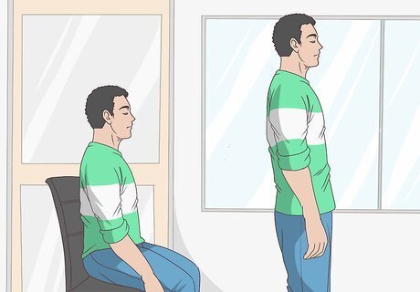 Practice good posture when you sit or stand. If you're in the habit of slumping over or slouching, you may be putting unnecessary pressure on your joints. To protect your neck, back, hips, and knees, imagine your body forming a straight line from your ears to your heels when you stand. Draw your shoulders back to bring your chest forward. To sit: Place a cushion behind your lower back for support and sit with your knees at a 90-degree angle. Remember to straighten your back and pull your shoulders back.