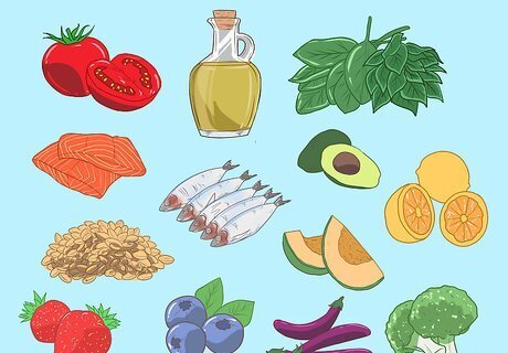 Eat an anti-inflammatory diet to manage your arthritis. Research shows that cutting back on processed foods which cause inflammation, white pasta, rice, and bread, for instance, and eating a Mediterranean-style anti-inflammatory diet can relieve arthritis. To get the health benefits of this diet, start eating:Inflammatory Foods to Limit:Sugar and aspartameSaltSaturated fat: cheese, red meat, full-fat dairyTrans fats: processed foodsSimple carbohydrates: white bread, white rice, cereal, pastaAlcohol Fatty fish: salmon, tuna, sardines Colorful vegetables: spinach, kale, broccoli, onions, eggplant, tomatoes, peppers Bright fruits: blueberries, cherries, blackberries, strawberries Nuts and seeds: walnuts, pine nuts, pistachios, almonds Beans and legumes: pinto, kidney, garbanzo Olive oil Whole grains: oats, brown rice, quinoa