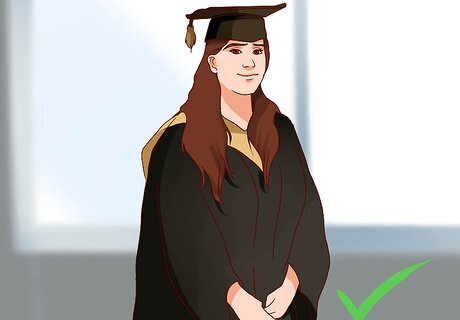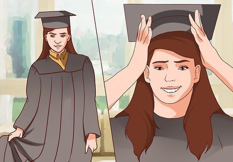 Put your graduation cap on correctly. Your cap, also known as a mortar board will be flat with a square top. It should be put on your head so that the board (the flat part) is parallel to your shoulders. The hat will have a tassel attached to the top on a button. It is customary that the tassel hangs on the right side of the hat until you graduate, then you move it to the left side of the board. If you have long hair, bring along bobby pins in case you need to fasten the cap to your hair to prevent it from flying off in the wind.