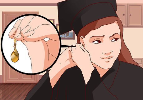 Choose accessories that accent your outfit and gown. Since most of your outfit will be hidden, and you have little choice over the cap and gown you'll wear, finding some accessories like jewelry can be a great way to personalize your look. A classic necklace like a string of pearls can really personalize your look as well as your favorite earrings. Sometimes there is custom jewelry made and sold by your school for the occasion. This can be a good way to commemorate the event with a piece of jewelry you'll always have.
