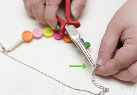 Secure the other end of the clasp. Grasp the loose end of your necklace securely so buttons don't fall off and hold your necklace up to your neck to check its length. You may need to add or remove some buttons before it's satisfactory. Then, tie your line to a jump ring, or a small metal ring for the clasp to latch onto, and pull the knot tight.