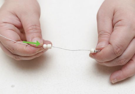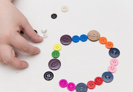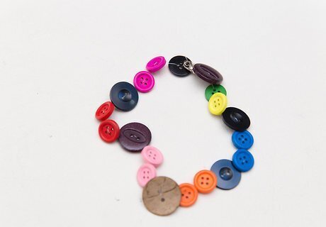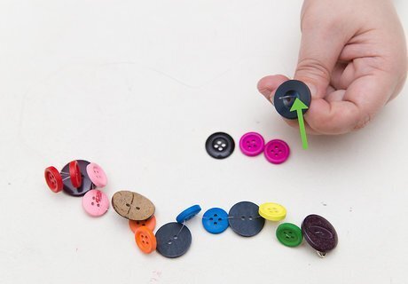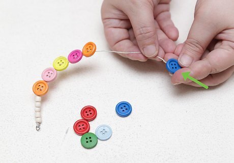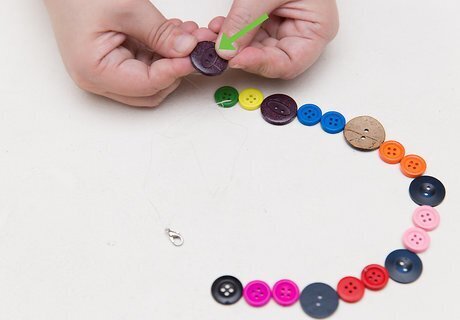 String your buttons. Remember, as you slide buttons onto the loose end of your line, the first button will form the outer edge closest to your clasp. This means that you'll likely have to string several buttons before you reach the center of the necklace, where you'll probably want to add a special button as a centerpiece.