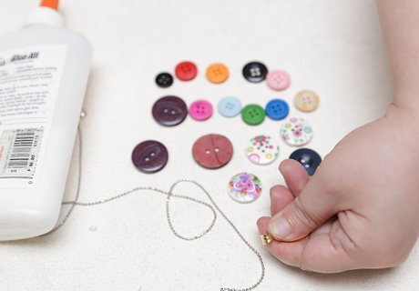 Gather or purchase your supplies. Most of these can be found at your local craft store, or in the craft section of a general retailer. Where glue is concerned, a transparent adhesive that works for most plastics and metal should work just fine for your buttons and bail, but if your buttons are made of something different, choose your glue accordingly. All together, you'll need: Bail (for attaching button) Ball chain Buttons Glue