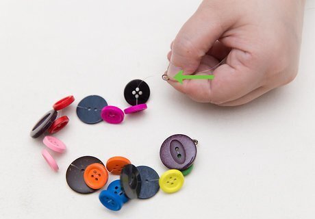Decide your threading pattern. You might alternate your line, threading it first in front of your button and then behind, to create an even arrangement of buttons. As mentioned previously, you can also stack smaller buttons atop larger ones, threading your line through the stack to give your necklace a 3-D look. The more buttons you stack atop each other, the more thread will be needed to accommodate the vertical threading through the stack.