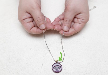 String your bail on your chain to complete the necklace. Take your ball chain necklace and unhook it at the clasp. Now you can string your bail and its attached button pendant design onto the chain. Clasp your new necklace onto your neck and see how it looks!