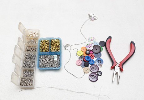 Assemble your necklace crafting tools. This button necklace will be strung on a wire, making it more durable than those that use thread. To shape the wire into loops, you'll need crimp beads and jewelry pliers, which you might not have but can be purchased from your local craft store. Including these items, you'll also need: Buttons Chain Clasp Crimp beads (2) Jewelry pliers Jump rings (2) Tiger-tail wire Wooden beads (4)