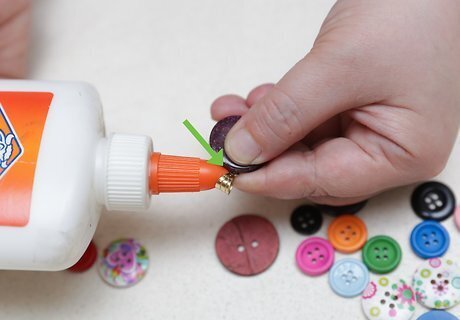 Glue your bail to your base and your buttons together. You might want to lay some newspaper beneath your crafting area to prevent glue from getting on your work space. Then use your glue to attach your largest button to your bail. Follow the directions on your glue to determine how long you should let your glue to set and dry. Then: Glue your middle button to the large button base. Allow this to set and dry according to label direction. Glue your final button atop the middle button and allow to dry.