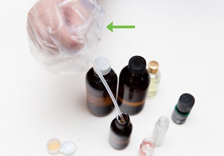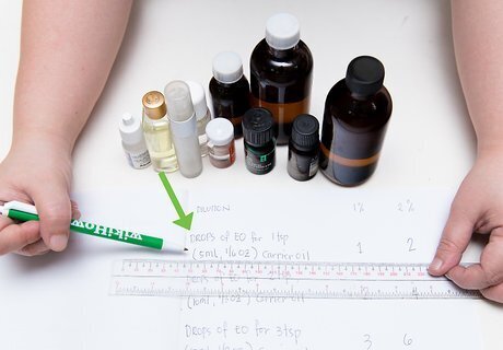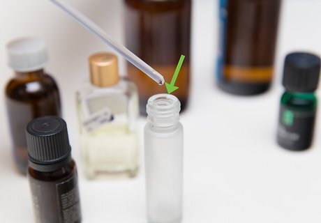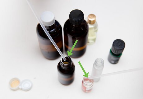 Make the mixture. Using two separate eye droppers to avoid cross-contamination, make your mixture based on the formula you have already established. If your formula calls for 12 drops of essential oil and 5 drops of carrier oil, use your eye droppers to extract the desired amount of each liquid and carefully squeeze it into the new container – making sure to count each drop carefully. Once you have added both ingredients, put the lid on and give it a good shake to ensure the contents are properly mixed. And don’t forget to label the bottle before you put it away and forget what is in it.