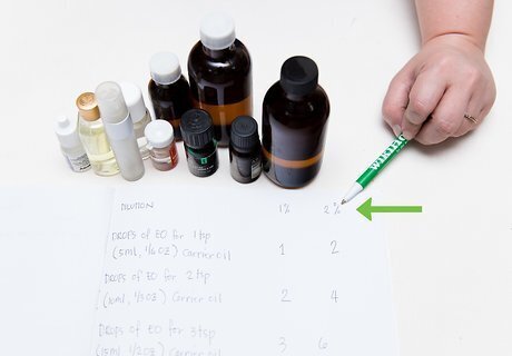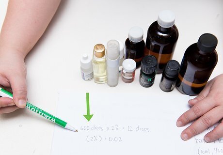 Use a formula to determine the number of drops of essential oil. You’ll need to know how many drops of essential oil to use in your dilution. The amount of essential oils required for various uses can vary, but in general you can use this formula: Total carrier drops x percent = drops of essential oil. For example, to make a 2% solution using one ounce of carrier, 600 drops x 2% = 12 drops. Note: To multiply a percent, you must use a decimal. 2% = 0.02 for the above example.