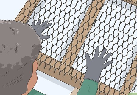 Use a staple gun to attach the chicken wire to the frames. Hold a rectangular piece of chicken wire up to a frame. Make sure that the edges line up and use the staple gun to secure the chicken wire to the furring strips. Place a staple approximately every 5 in (13 cm) along the furring strips so that the chicken wire is well attached.
