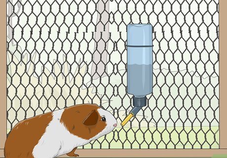 Attach a water bottle to the side of the run. Hold the water bottle against the chicken wire on the outside of the run. Position the nozzle through the chicken wire around 4 in (10 cm) off the ground so that the guinea pig can reach it. Use the water bottle hook to secure it to the chicken wire. Always make sure that your guinea pig has fresh water available.