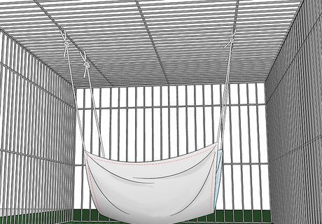 Hang the hammock to the top of your hamster’s cage. Tie the string coming out of the corners of the hammock to the grate at the top of your cage. The knots on the string should hold the hammock in place when your hamster sits on it.