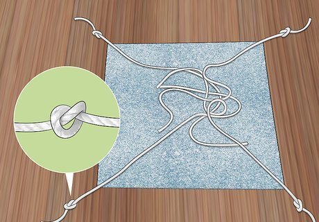 Tie knots in the ends of the string and place them in the center of the fleece. Place each string over the top of the fleece cloth with the knot side hanging over each corner of the fleece square. The knotted end of the string should rest on the flat surface under the fleece square. Each string should be positioned so the non-knotted end is resting in the center of the cloth.