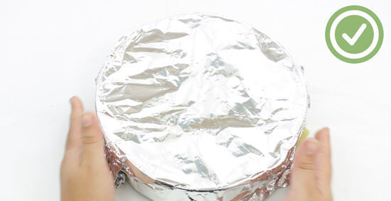 Cover the cake with aluminum foil during the last third of its cooking time. Aluminum foil helps to reduce evaporation of the steam produced by the cake as it cooks and keeps more moisture in. The layer should cover the cake but it doesn't need to seal completely. If you're using baking strips, skip this step.