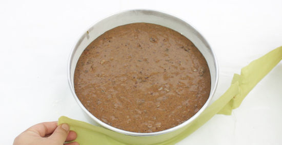 Use baking strips to protect the outer layer of the cake and prevent drying. Baking strips keep the edges of your pan cool and promote a level and moist cake. Since Christmas cakes are dense and contain fruits, slow baking times are ideal. Place your dry baking strip around the cake's pan and thread the strip through the strap. Now, remove the strip and run it under cold water. After it's saturated, squeeze the excess water out and then place the strip around the pan. Finally, tighten any loose straps. Purchase baking strips from big-box and kitchen stores. Swap standard baking strips with aluminum foil or old towels soaked in water.