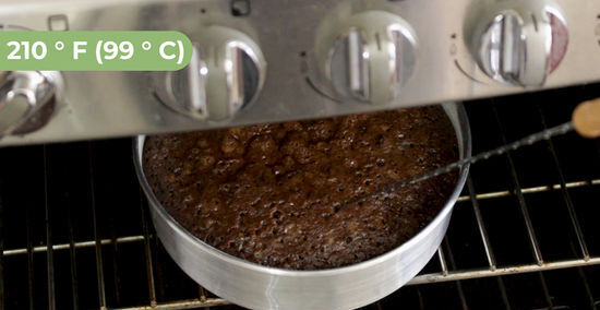 Check your cake's temperature only after the minimum baking time. After you let your Christmas cake sit in the oven for the minimum recommended time, open the oven door. Now, insert a digital thermometer into the center of the cake and check the reading—it should be about 210 °F (99 °C). If not, leave it in the oven until it reaches this temperature, but never anything higher or it will get dry and crumbly! Be sure not to touch the bottom of your cake's pan with the digital thermometer or you won't get an accurate temperature reading. Don't check the temperature before the minimum baking time—opening the oven door during this period will ruin your cake! Always take temperature as fast as possible to avoid cooling the cake down.