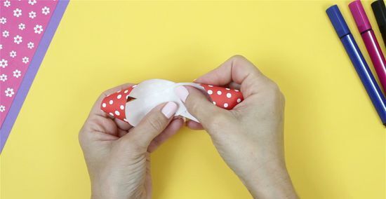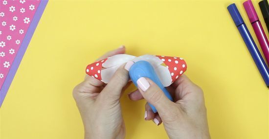 Glue the pointy ends of the mustache shape to the middle. Place a drop of hot glue in the middle of your mustache shape. Take the left pointy end of the mustache, and press it into the glue. Repeat this step with the right pointy end to get something that looks like a looped bow. Scrapbooking paper has a blank side and a patterned side. Make sure that you are gluing to the blank side of the paper. If you don't have hot glue, use a glue dot instead. It's a double-sided adhesive circle that comes on a roll or sheet. You can find it in the scrapbooking section of a craft store.