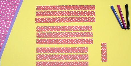Cut your desired paper into different sized strips. Wrapping paper will work the best for this, but you can also use scrapbooking paper. Cut your paper to the following sizes: 3 large strips that are 1 by 11 ⁄2 inches (2.5 by 29.2 cm). 3 medium strips that are 1 by 10 ⁄2 inches (2.5 by 26.7 cm). 3 small strips that are 1 by 9 ⁄2 inches (2.5 by 24.1 cm). 1 tiny strip that is 1 by 3 ⁄2 inches (2.5 by 8.9 cm).