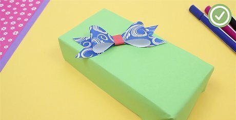 Wrap a thin strip of paper around the middle of the bow, if desired. Cut a thin strip out of matching paper, about ⁄2 inch (1.3 cm) wide. Wrap the strip of paper around the middle of your bow, then glue down the end in the back of the bow. Alternatively, roll and glue the strip into a small ring. Close 1 side of your bow, slide the ring onto it, then open it back up again.