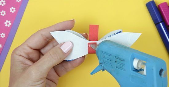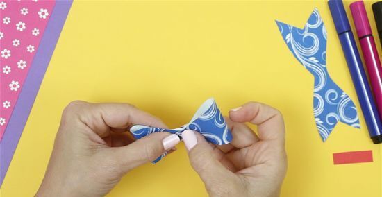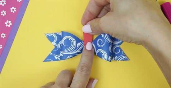 Glue the skinny rectangle to the middle of the bow. Place a drop of glue in the middle of your bow, then press the rectangle into the glue. Make sure that the rectangle is perpendicular to the bow, creating a + shape. If you are using patterned paper, make sure that the colored side is facing up.